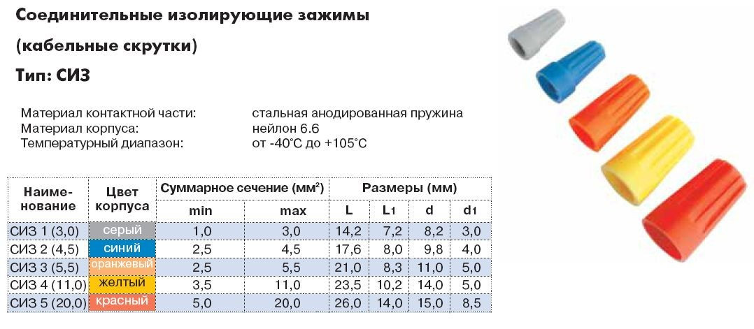 Для каждого сечения провода и количества жил в скрутке предназначен свой размер колпачка СИЗ. Например, для соединения двух проводов нужен один колпачок, а для трех-четырех — уже побольше.