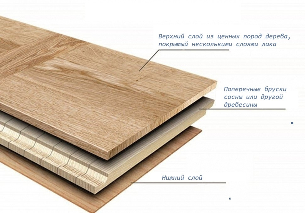 - Нижний слой обычно выполнен из фанеры, шпона или другого материала, который держит верхние плашки вместе, обеспечивая прочность и стабильность доски.