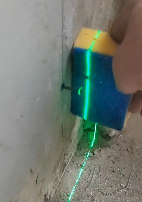 Лазерный уровень значительно ускоряет разметку, поэтому мы используем его для создания вертикальной плоскости с минимальным расстоянием до стены. Для этого закрепляем уровень возле стены и поворачиваем его, чтобы найти оптимальную плоскость. Просмотр и определение плоскости занимает какое-то время.